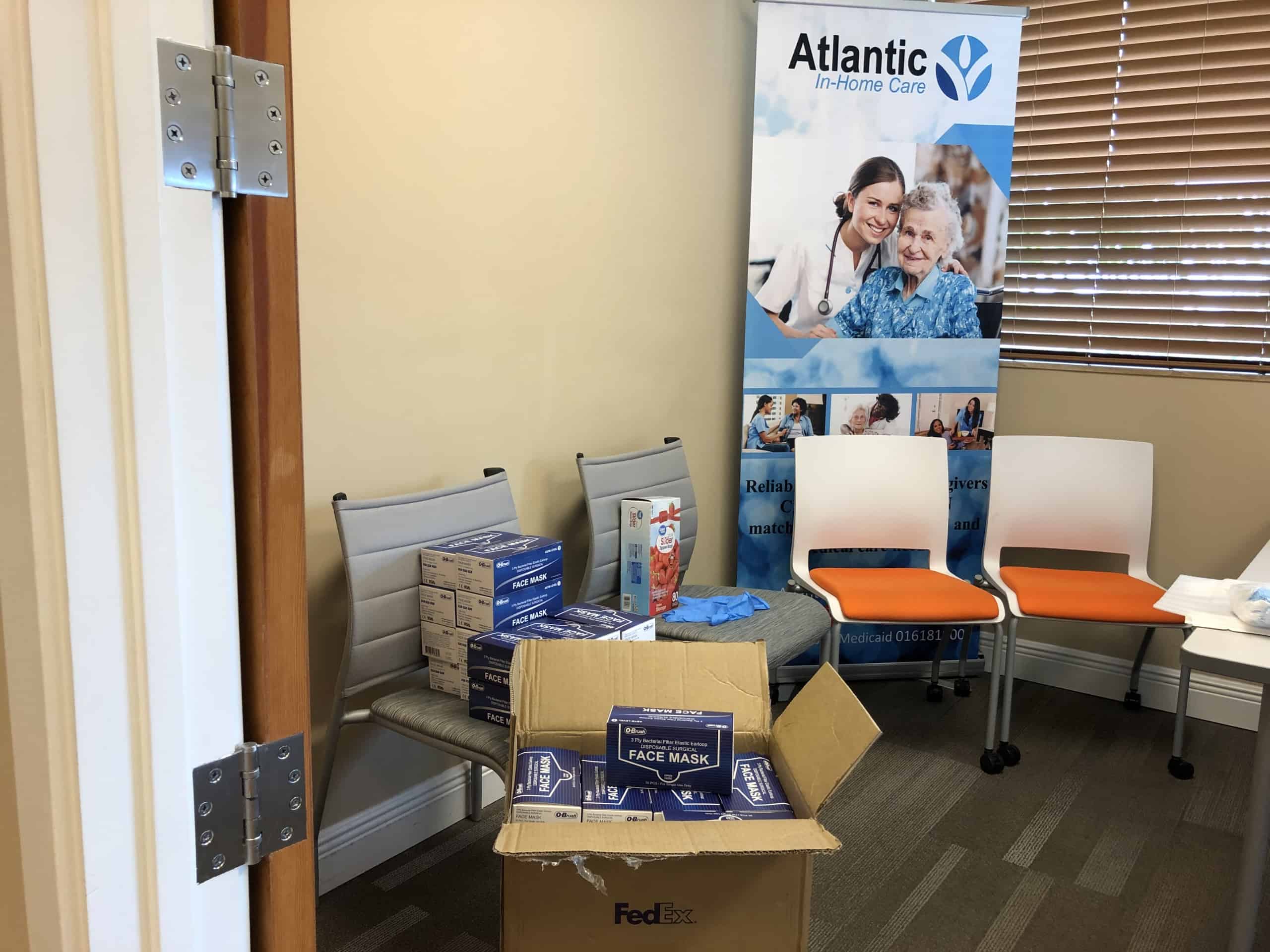 Very excited to finally get a shipment of surgical masks (from Hong Kong)… office team is packaging today, April 9, in our conference room to give out to caregivers tomorrow for Atlantic clients. Each caregiver will get enough masks to cover all of their scheduled shifts for the next 4 weeks. Setting up drive by pickup in the parking lot.